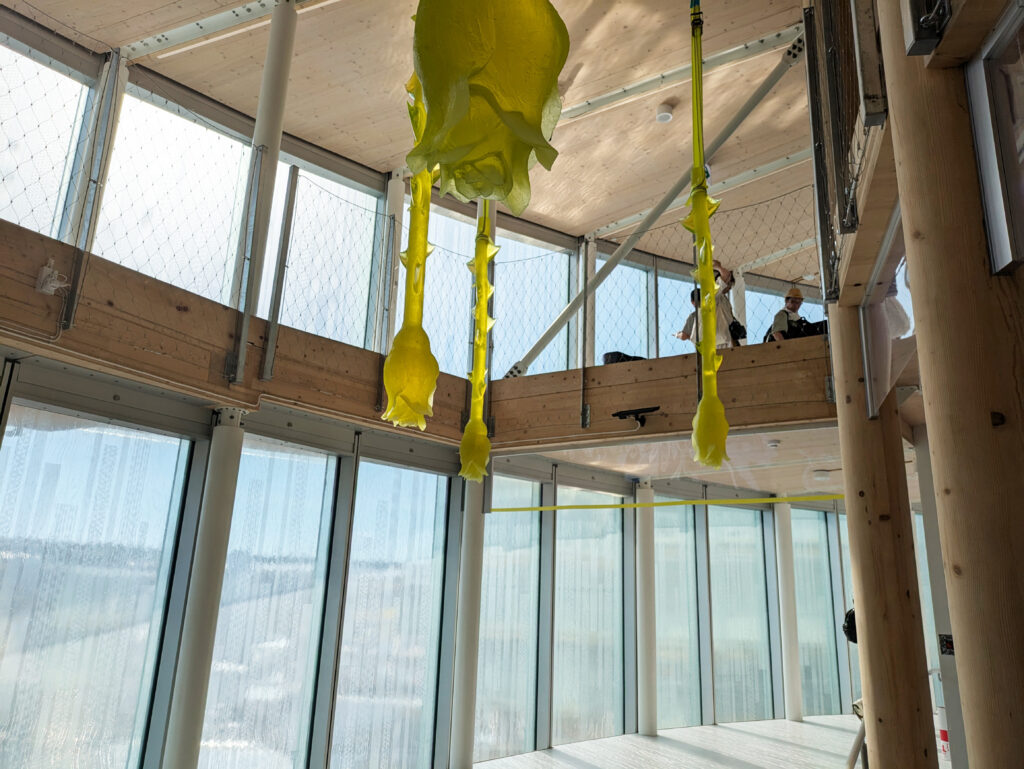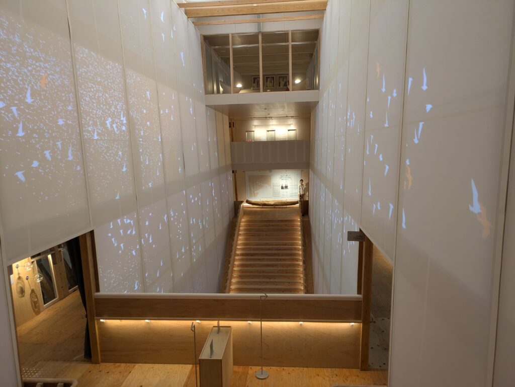 象徴的な丸みを帯びた三角形の天井は、「循環」「サステナビリティ」「生命の流れ」を表現しています。